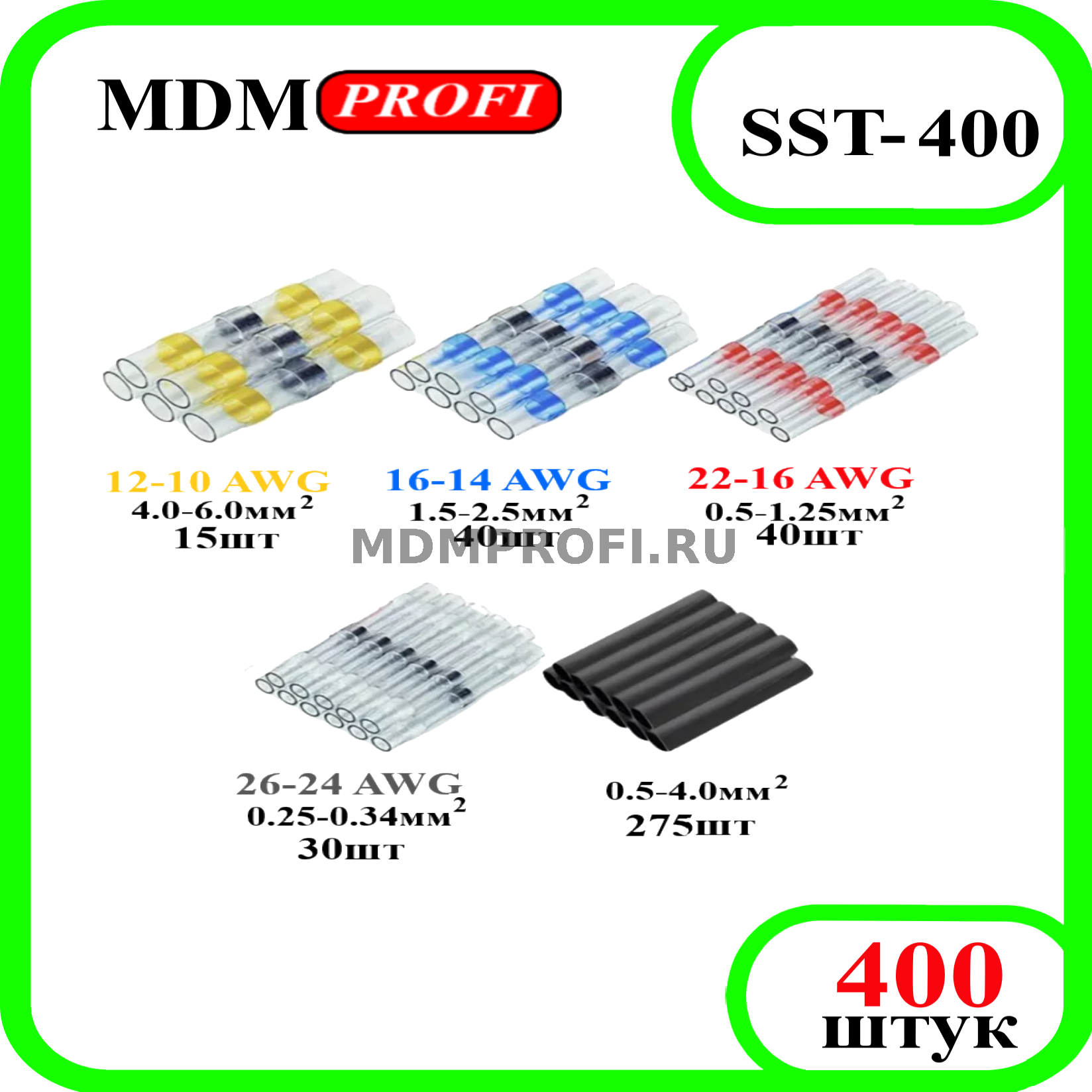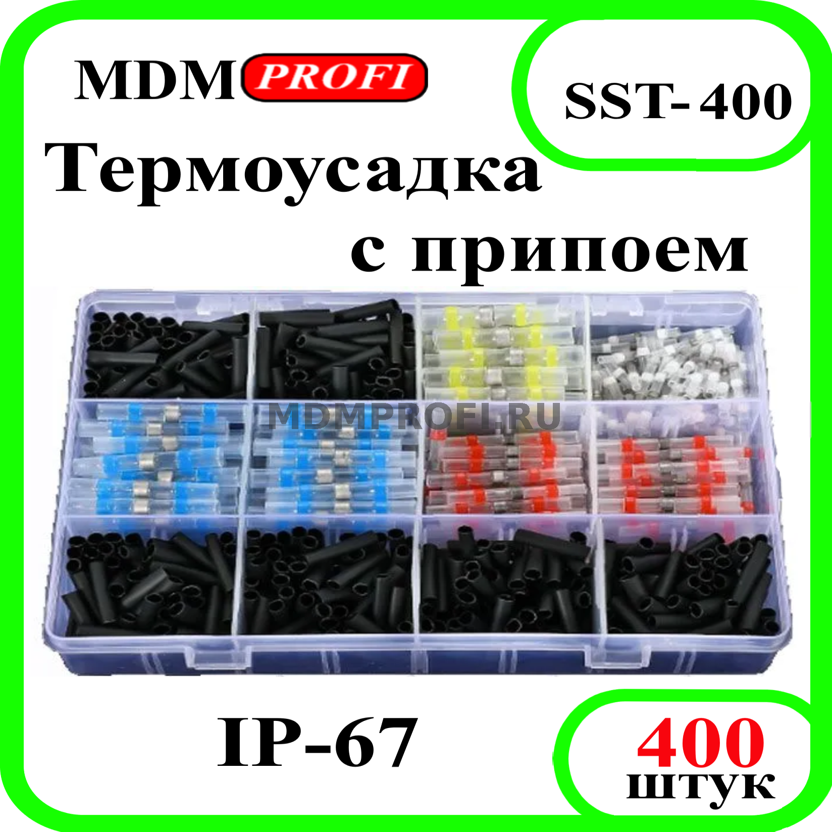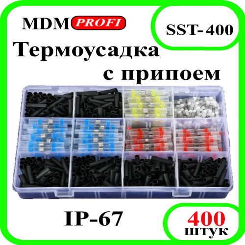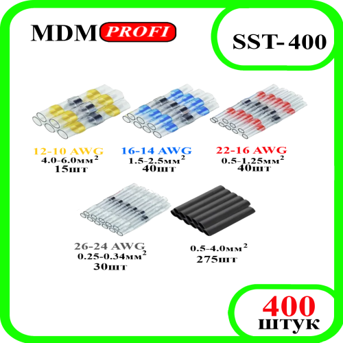 Набор термоусадочных соединителей "MDM PROFI" с припоем для проводов диаметром 0,25-6мм. Позволяют легко соединять провода без обжима и пайки. При нагреве гильзы-втулки, быстро и легко происходит полностью герметичное, крепкое соединение провода с пропайкой и уплотнением термоусадкой.